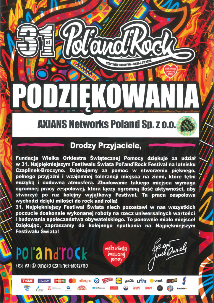 Axians Networks Poland Sp. z o.o. jako doświadczony dostawca rozwiązań w zakresie budownictwa telekomunikacyjnego zapewnił organizatorom oraz uczestnikom festiwalu łączność w technologii radiowej. Nasze szerokie kompetencje i posiadane zaplecze sprzętowe umożliwiły kompleksową realizację niniejszego projektu przy zachowaniu najwyższych standardów bezpieczeństwa.