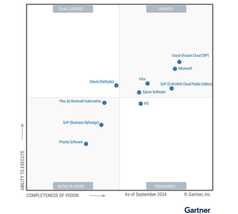W ostatniej edycji raportu Gartnera „Magic Quadrant for Cloud ERP for Product-Centric Enterprises” z listopada 2024 roku, oceniający dostawców chmurowych systemów ERP dla przedsiębiorstw produkcyjnych, wśród liderów rynku po raz kolejny znalazły się Oracle, Microsoft, Infor oraz SAP. Do grona liderów dołączył również Epicor, który jeszcze dwa lata temu znajdował się w kategorii „Pretendenci” (Challengers). Celem raportu jest pomoc firmom produkcyjnym w wyborze optymalnego systemu ERP, uwzględniając kluczowe trendy rynkowe.