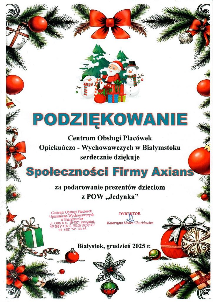 W Axians odpowiedzialność społeczna stanowi istotny element kultury organizacyjnej. Pracownicy firmy konsekwentnie angażują się w inicjatywy wspierające osoby oraz instytucje potrzebujące pomocy, a większość działań społecznych ma charakter oddolny – powstaje z inicjatywy pracowników i jest przez nich aktywnie współtworzona. W tym roku, w okresie przedświątecznym, Axians ponownie wsparł ogólnopolską akcję Szlachetna Paczka oraz podopiecznych Placówki Opiekuńczo-Wychowawczej „Jedynka” w Białymstoku.